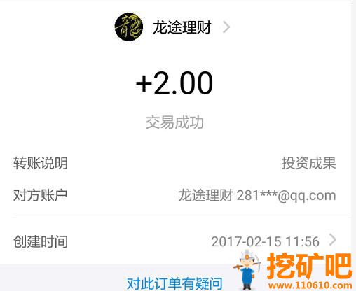 龙途理财矿场2月15日收款2元...