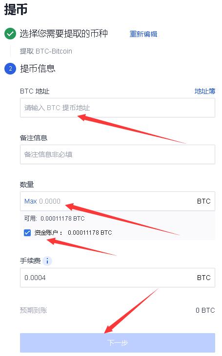 4、在提币信息界面粘贴你复制的地址,输入数量,选择想要提币的账户,资金账户、币币账户等,均支持提币操作。最后点击下一步,等待okex放币,网络确认达到指定数量后就到账了。
