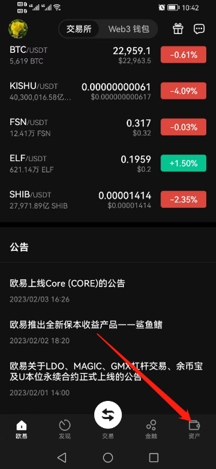 当你的core币已经在小狐狸钱包以后,需要进入欧易交易所,打开资产,点击充币。
