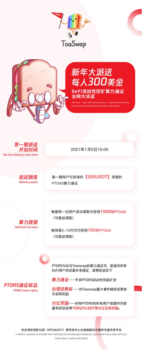 免费领取算力挖矿!吐司Toaswap社区承诺,在指定时间内吐司令PTOAS可1:1直挖对应价值的币(首期含TOAS/FIL/DOT代币)