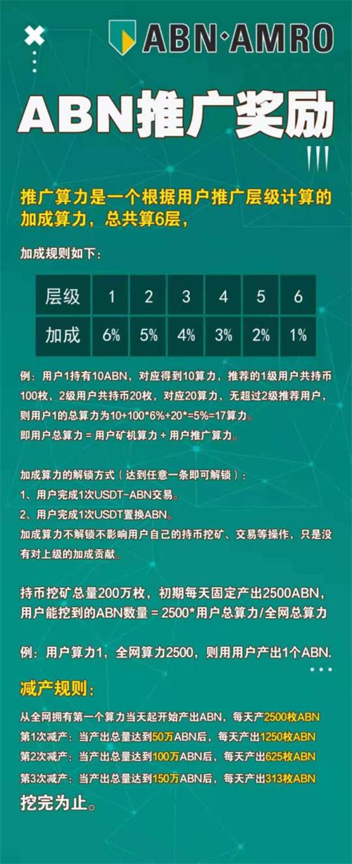 从全网当天第个算力起开始产 出ABN,每天产2500枚ABN;第1次减产:当产出总量达到50万ABN后,每天产出1250枚ABN;